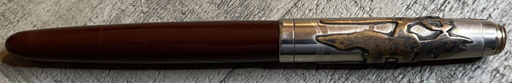 JC929. PARKER “51” Vacumatic in Cordovan Brown with Ariel Kullock Lustraloy cap with applied brass “devil” design. Great work, signed. Date code of 1947. Fine 14k nib. Completely restored and working, $300