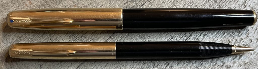 JV720. PARKER “51” Aerometric Set in Black with gold filled caps in original box. Very nice caps with no dents or dings. No date code on pen and 1951 date code on pencil. Fine 14k nib. Completely restored and working, $200
