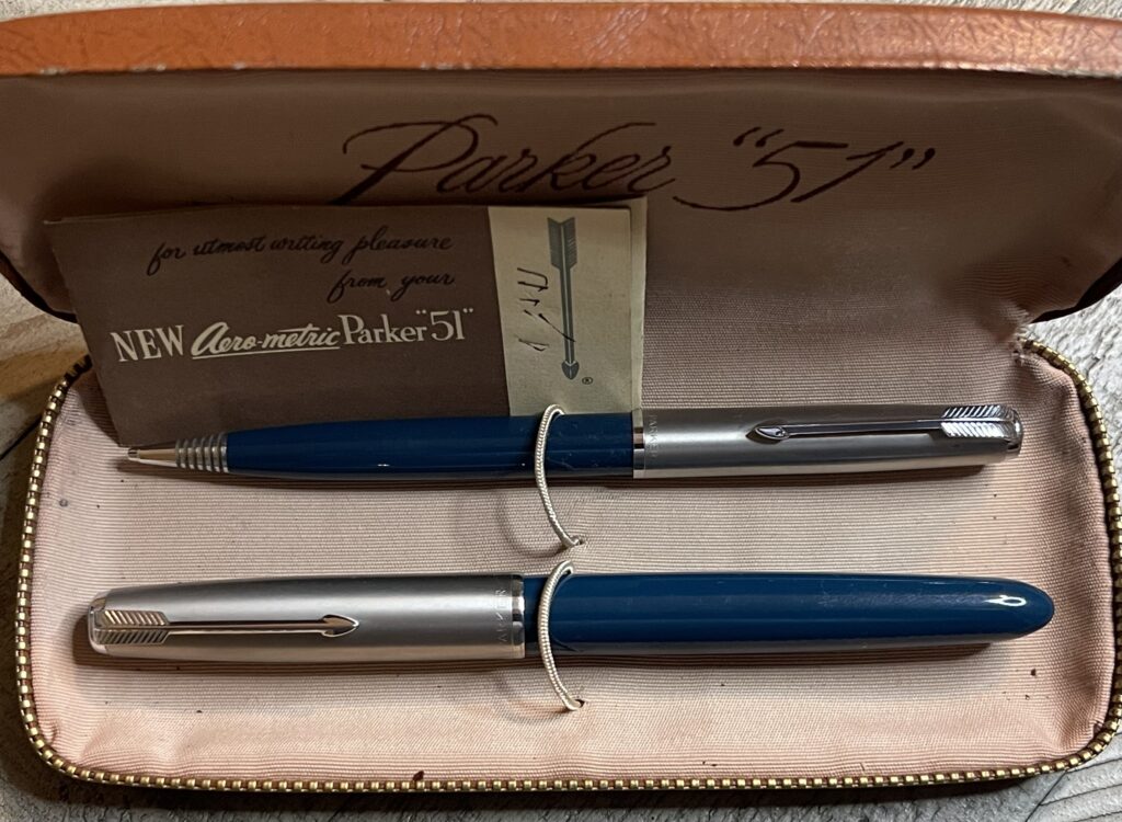 JV340. PARKER “51” Aerometric Set in Navy Gray with lustraloy caps in original box. Pen cap is used but in good condition with no dents or dings. Pencil appears mint, never used. Dated 1949. Medium 14k nib. Completely restored and working, $175