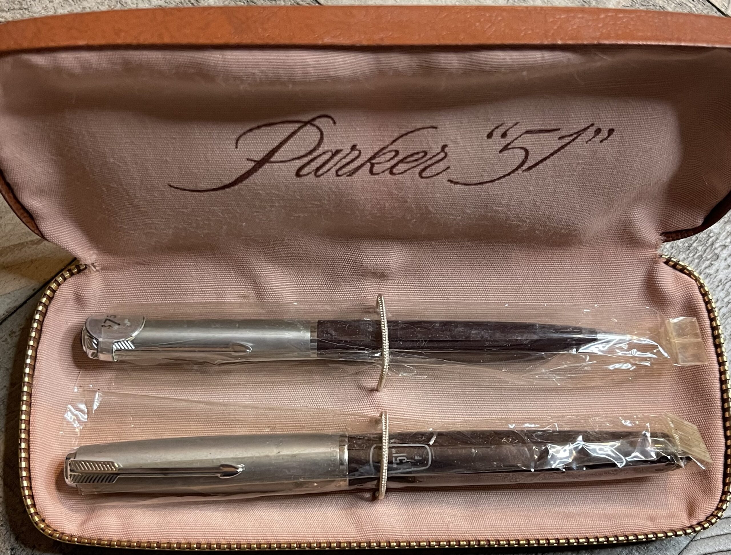 JC919. PARKER “51” Aerometric Demi Set in Cocoa with Lustraloy caps in more unusual Bagatelle Parker carrying case. New old stock, never filled with stickers and tag. 14k fine nib. Cannot be returned if filled or dipped, $300