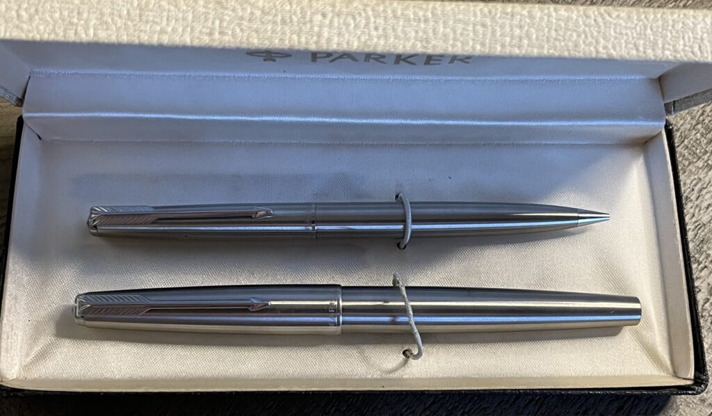 JC956. PARKER 61 Flighter set in all Lustraloy caps and barrels. New Old stock set never filled. Pink color still on filler sponge. Perfect set. Fine 14k nib. Cannot be returned if filled or dipped, $200